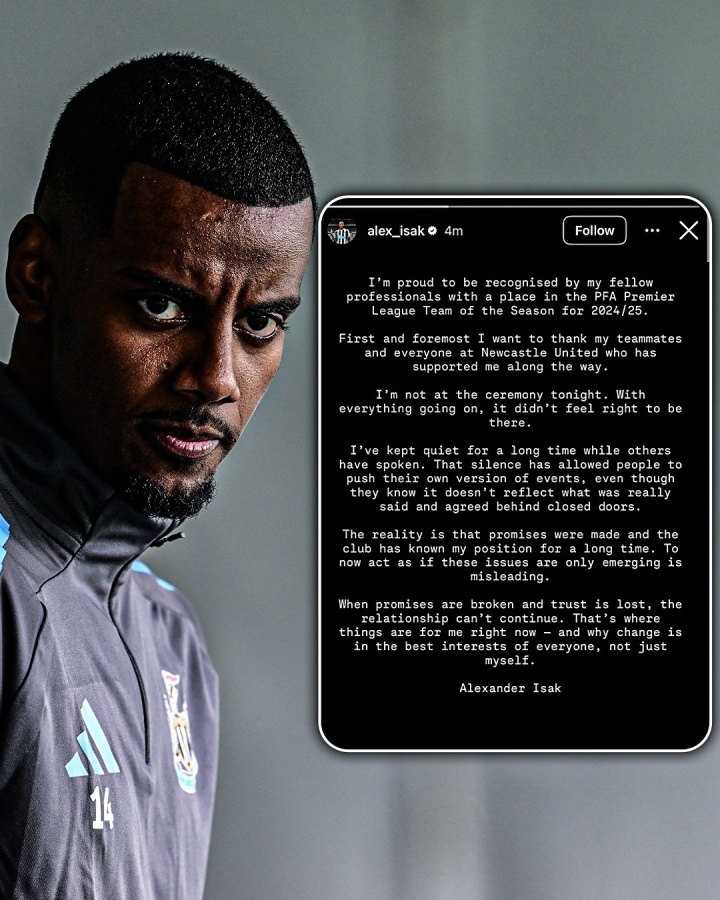 8月19日:伊萨克缺席PFA颁奖礼,通过社媒声明指控纽卡违背承诺,称"分手对双方都是最佳选择"。